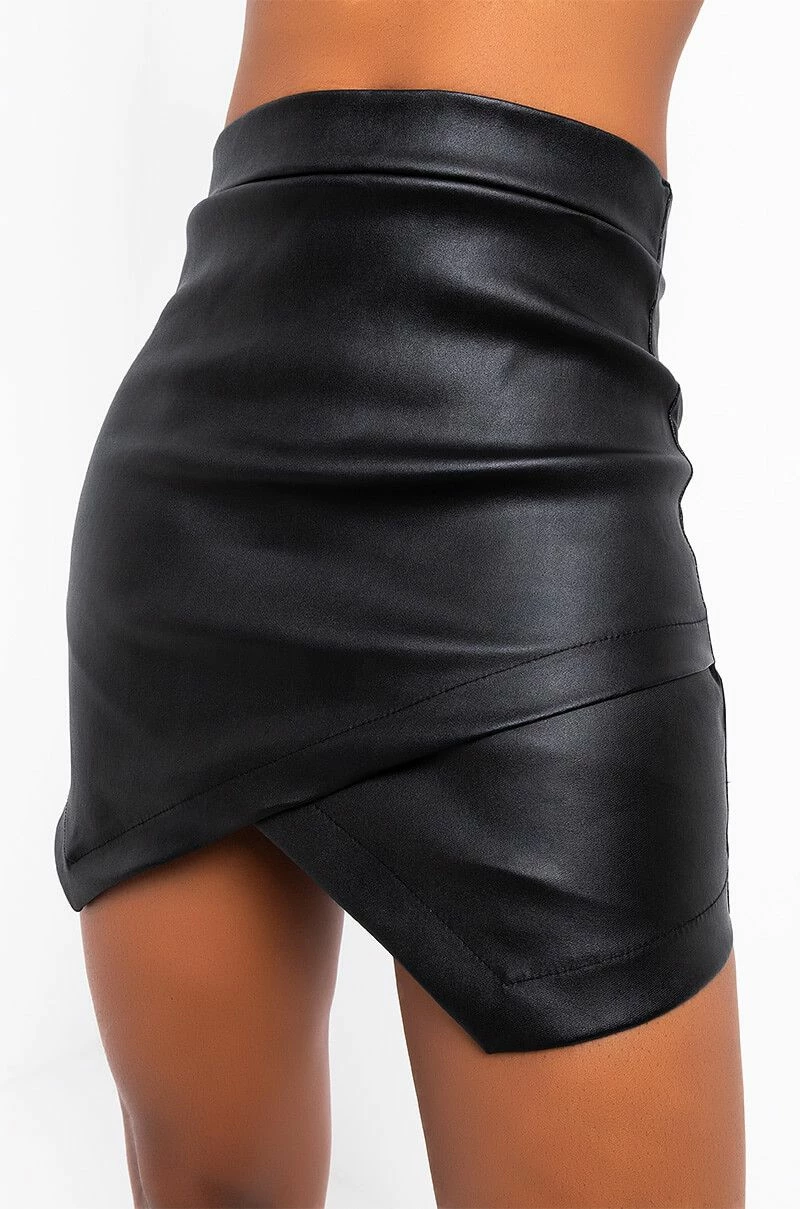 Make your move in the AKIRA Label Play Or Be Played Pleather Mini Skirt. Designed with a high waist rise, this sleek mini skirt features a faux leather base, tonal back zipper, curve accentuating fit, and an asymmetrical, wrap front hem. Style with a balloon sleeve blouse and pointed to heels for a look that wins.