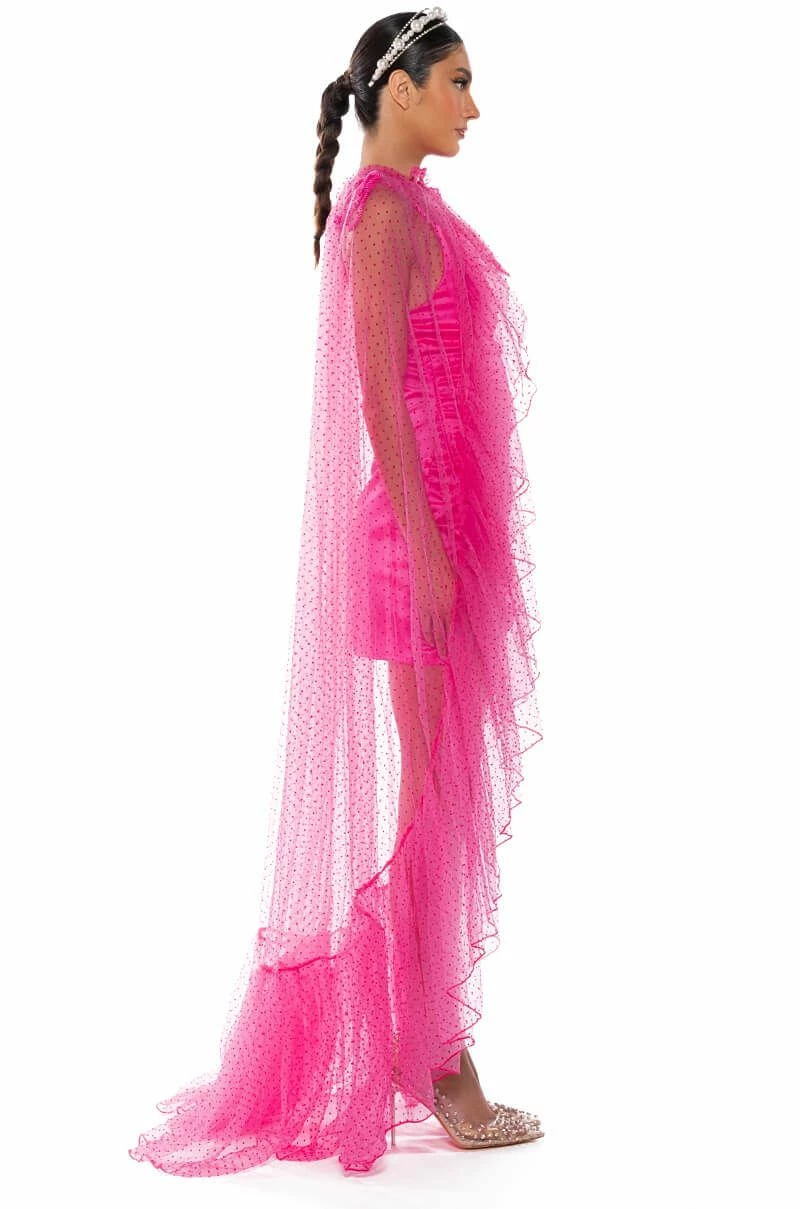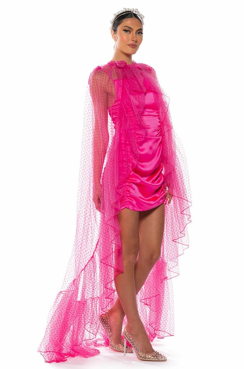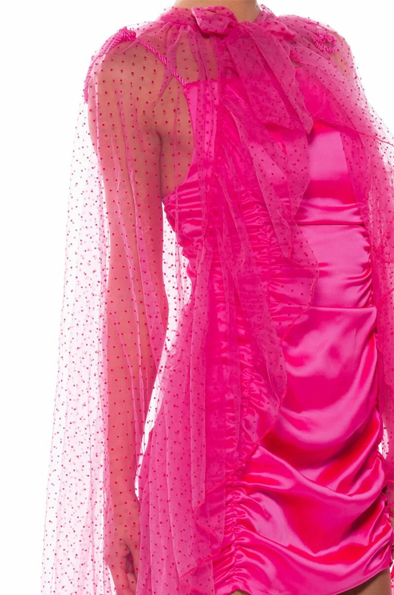 The AKIRA Label Polka Dot 2-in-1 Cape Belt Duo is a unique number made from a sheer mesh base, featuring a raised velvet polka dotted design, a front bow-tie closure, and a multifunctional layered cape or belt design. Complete your bold and dramatic look with this piece, tie around the waist for a glamorous train skirt or over the shoulders as a cape.