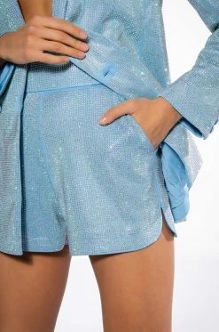 Get your choreo ready, it’s time to put on a show in The AKIRA Label Pop Star Shine Bright Rhinestone Hot Short in Light Blue. This rhinestone-embellished satin dolphin short features a high rise waistline, slant side pockets, and a hot pant silhouette. Complete your look with The Pop Star Shine Bright Rhinestone Blazer in Light Blue.