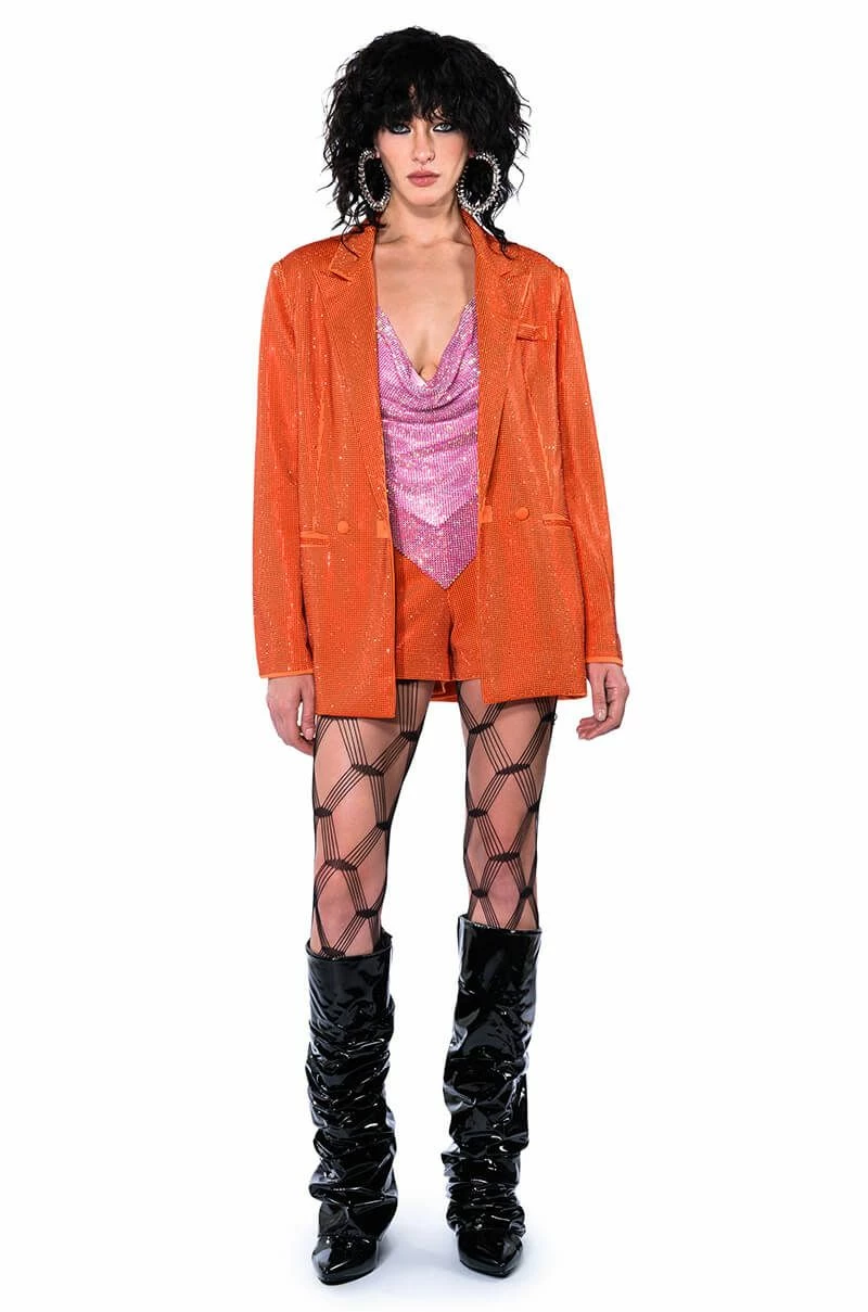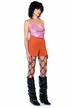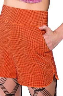 Get your choreo ready. Put on a show in The AKIRA Label Pop Star Shine Bright Rhinestone Hot Short in Orange. This rhinestone-embellished satin dolphin short features a high rise waistline, slant side pockets, and a hot pant silhouette. Complete your look with The Pop Star Shine Bright Rhinestone Blazer in Orange.