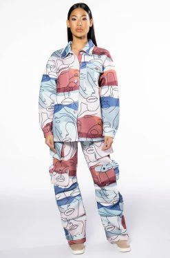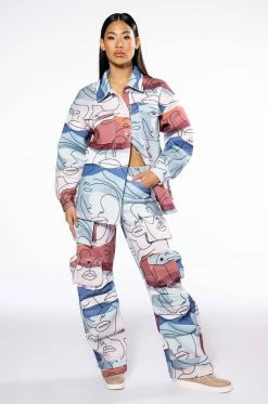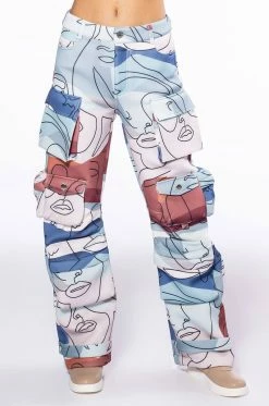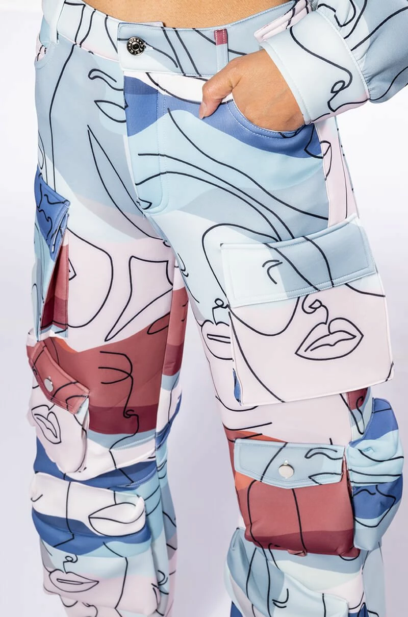 The AKIRA Label Making Faces Printed Cargo Pants feature a soft scuba knit fabrication, abstract silhouette print patterning, a high rise waist, belt loops, a classic 5-pocket design, and cargo pockets rendered in flap front, snap button, and zip top designs. Complete with a classic zip button closure, a wide leg silhouette, triangular stitching at the knee, and ankle strap detailing. Pair with the coordinating AKIRA Label Making Faces Oversized Printed Button Down.