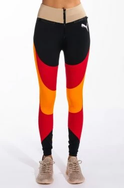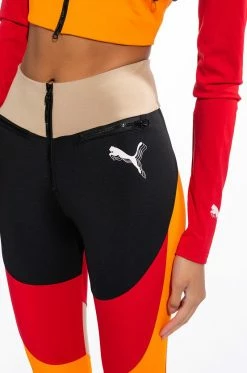 The PUMA Multi Color Love Legging features a smooth and stretchy nylon blend fabrication, a color block design, dual front zip pockets, a front zip closure, a bodycon fit, and skinny ankle hems. Complete with a jumping cat logo at the thigh.