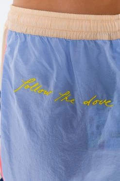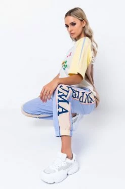 Sport these fun track pants that are a delicious creative collaboration with Kid Super + PUMA. These baby blue and tan track pants feature a variety of decorative patches designed by illustrator Kid Super. The words “Kid Super PUMA”, are printed on the side of each pant leg in navy blue graphics. The words, “Kid Super Studios”, are stitched in baby blue on the front of the left thigh beneath a classic PUMA logo in navy blue. “Follow the Love”, is stitched in yellow on the left butt cheek opposite a slash pocket that hides a matching zipper. Wear with the matching PUMA & Kid Super Color Block Tee and your favorite pastel sneakers for a graphic sport look.