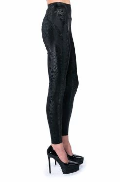 The AKIRA Label Rio Print High Rise Leggings With 4 Way Stretch in Black are the perfect faux leather leggings to get you through fall and winter. The stretchy leggings are complete with an elasticated waistband, a high rise fit, a snakeskin print faux leather fabrication, and a bodycon ankle length silhouette. Style them with a slouchy sweater and thigh high boots for a stylish wintery look.