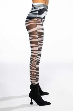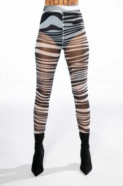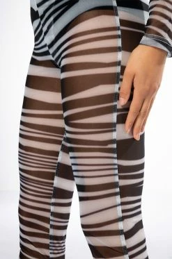 The AKIRA Label Set You Straight Mesh Legging features a high rise silhouette, an elasticated waistband, a stretchy sheer mesh fabrication, stripe print patterning, and a curve-hugging ankle-length silhouette. Style them with the coordinating AKIRA Label Set You Straight Long Sleeve Mock Neck Bodysuit for a bold matching look. Shown undergarment not included.