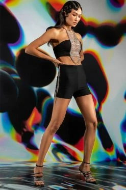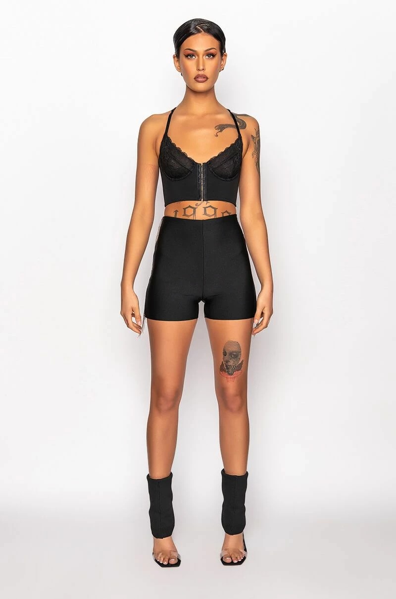 The AKIRA Label Shake It Fringe Detail Bandage Short features a bodycon bandage knit fabrication, a high rise waistline, an elasticized waistband, and a mini short length. Complete with metallic beaded chain fringe side stripe detailing. Pairs perfectly with button down shirts and strappy sandals.