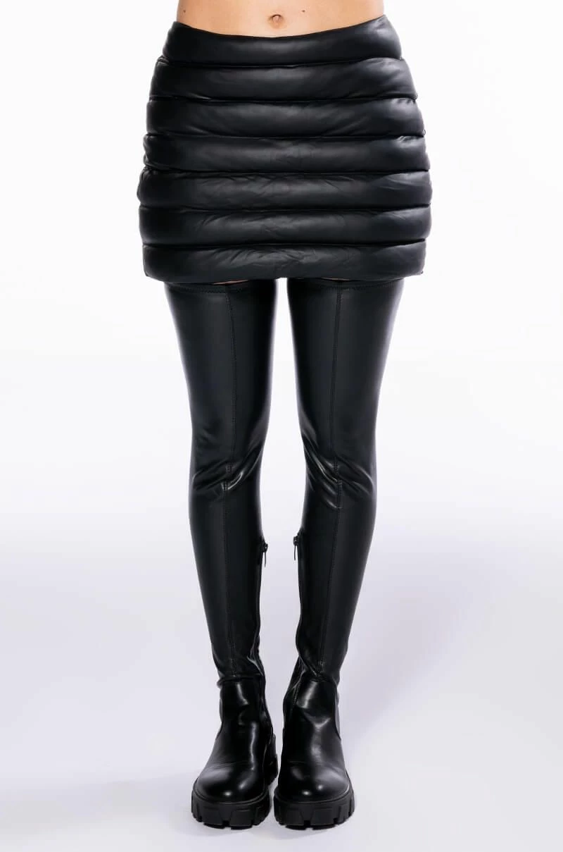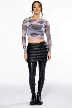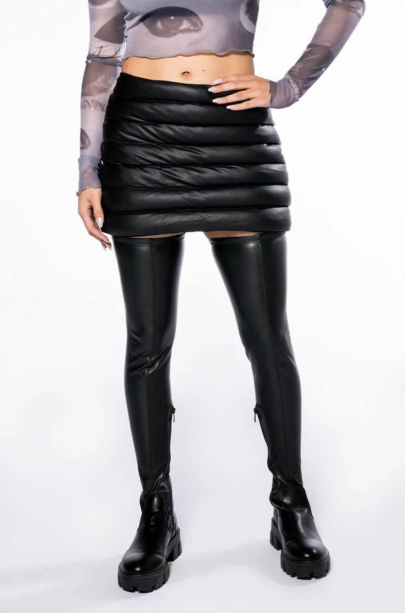 The AKIRA Label Star Chasing Mini Skirt in Black is a futuristic piece featuring a soft yet sleek fabrication, a quilted puffer front, a thin elastic back band, a sexy ultra-mini silhouette, and a back zipper closure. Pair with an oversized band tee or a chic white cropped tank to complete your out of this world ensemble.