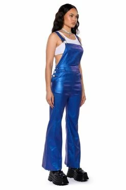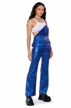 Forever far out. The AKIRA Label Stay Wavy Metallic Overalls feature a shimmer, stretchy, denim-inspired fabrication, a classic pinafore design, adjustable buckled bib straps, a large bib pocket, functional belt loops, button sides, slant side pockets, and back pockets, Complete with a wide leg fit.