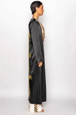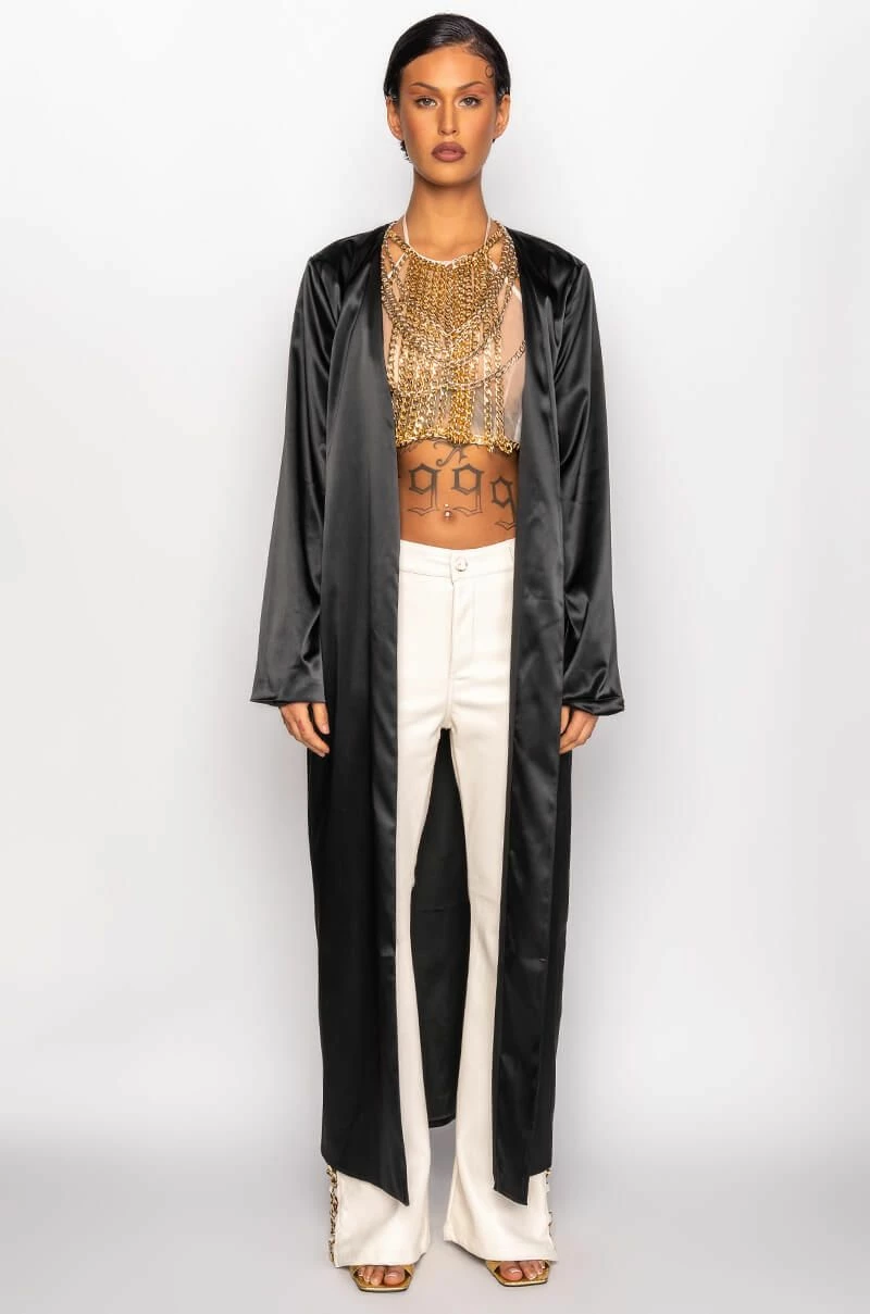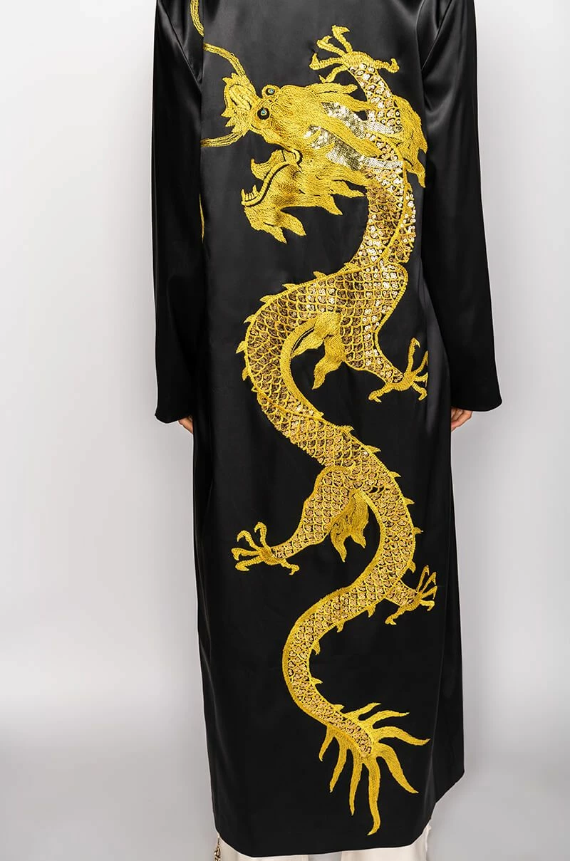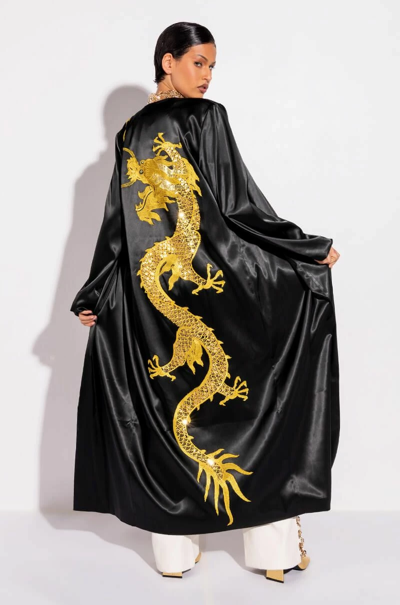 The AKIRA Label Sumptuous Satin Duster With Embroidered Dragon is made from a layered satin fabrication and is complete with long sleeves, an open front, a maxi length silhouette, and a large embroidered dragon on the back with sequin detailing. Pair this piece with casual or dressed up looks alike to add some color and fierce dragon power to your look!