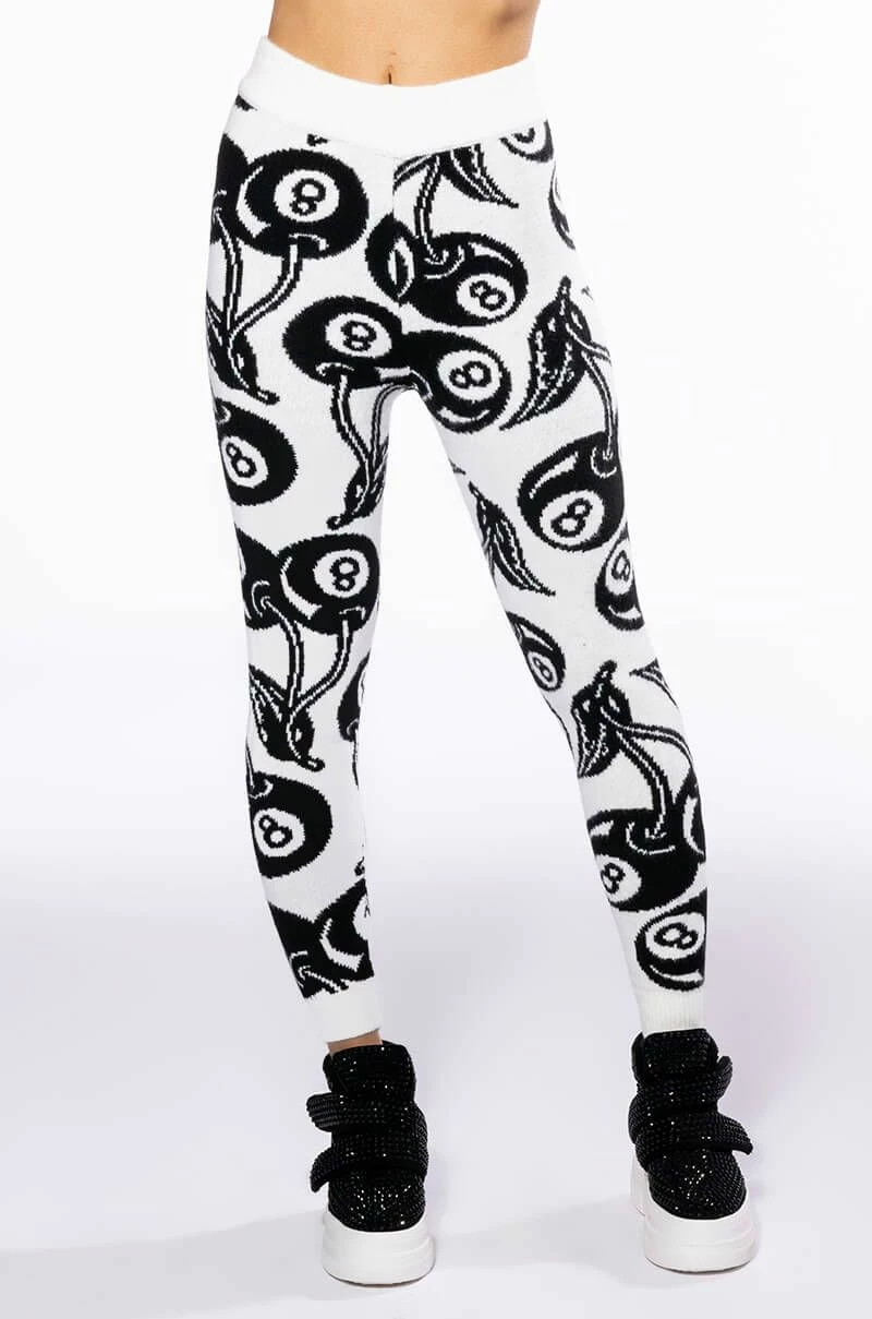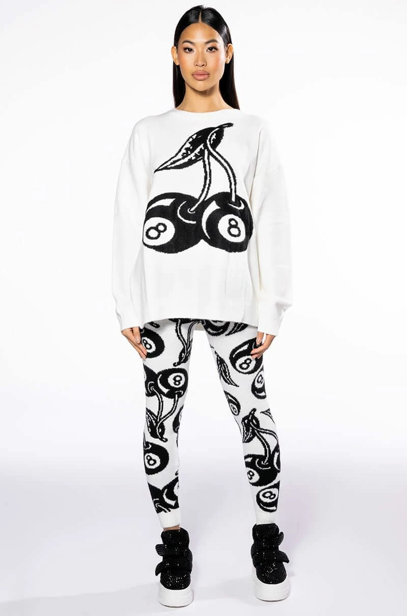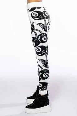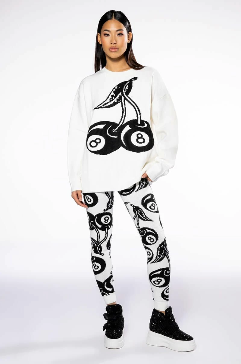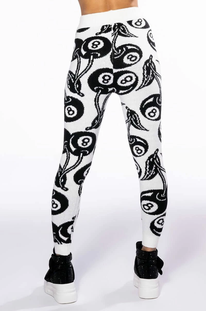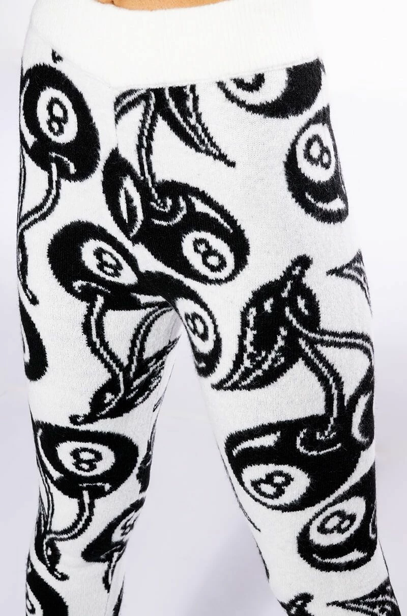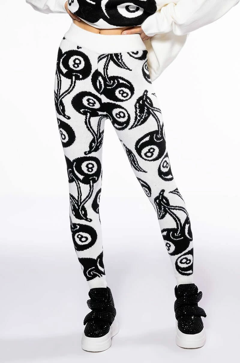 The AKIRA Label Sweet Luck Sweater Legging is a cozy loungewear piece featuring a knit base, a high waist rise, an elastic waistband, bodycon fit, ribbed knit hems, and an eight ball and cherry hybrid print. Pair with the coordinating AKIRA Label Sweet Luck Pullover Sweater to complete the look.