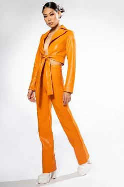 ยกCon mucho amor! The AKIRA Label Te Quiero High Rise Vegan Leather Straight Leg Pants In Orange are a stretchy vegan leather pant featuring a soft fleece lining, belt loops, a high rise waistline, two back pockets, and wide leg silhouette. Complete with a front button and zipper closure.