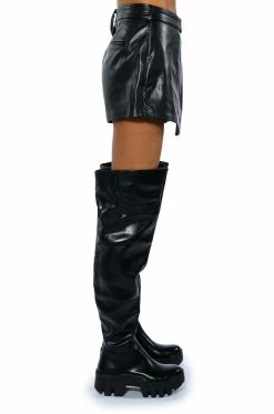 The AKIRA Label The Baddest Belted Faux Leather Skort With 4 Way Stretch features a stretchy vegan leather fabrication, a wrap front design, side zipper closure, inner shorts, and a push lock buckle belt. Complete with functional belt loops, a soft inner lining, and welted faux back pockets. your look with a cozy cropped cardigan and a pair of chunky booties.