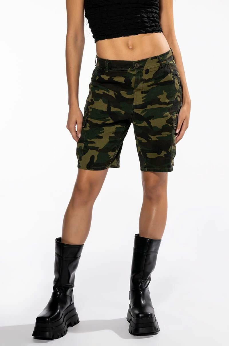 The AKIRA Label Tory Camo Shorts are made from a structured cotton and feature a camo print, a high rise waist, working belt loops, slant pockets, cargo button flap side and back pockets, a boxy fit, and a long inseam. Complete with a front button and zipper closure.