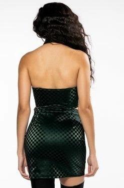The AKIRA Label Try As I Might Corset is made from a glossy vegan leather fabrication and features a checkered pattern, a halter, a plunging neckline, boning for structure, a sexy open back, a cropped silhouette, a pointed hem, and hook and eye front closures. Pair this piece with the matching AKIRA Label Try As I Might Mini Skirt to complete your look.