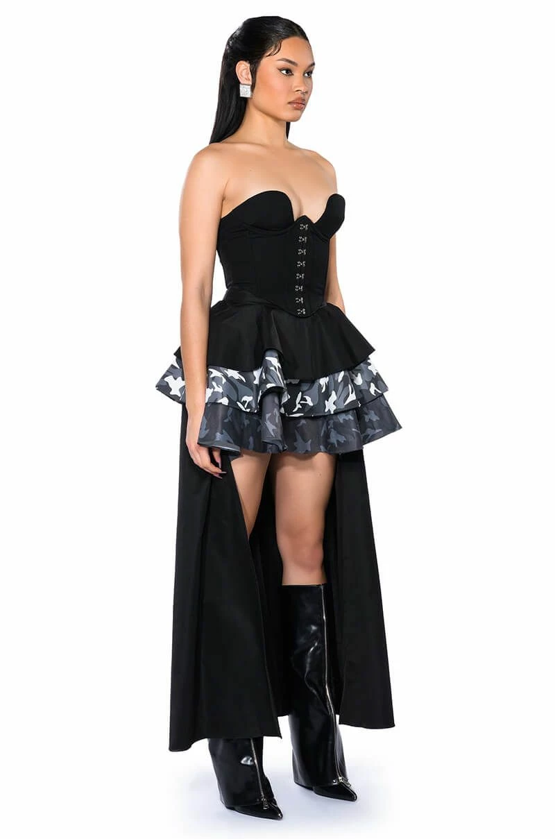 The AKIRA Label Unbothered High Low Hem Ruffle Maxi Skirt is made from a slick fabrication and features a high rise waist, a wide waistband, layered camo print ruffles with netting, a high low hem, a maxi length silhouette, and an exposed back zipper closure. Style this piece with a mock neck bodysuit and knee high boots to complete your fierce look.
