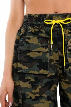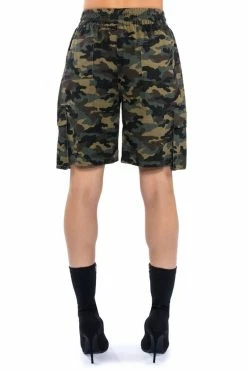 The AKIRA Label Unbothered Oversized Camo Shorts are made from a structured cotton and feature a graphic camo print, a high rise waist, a shirred elastic drawstring waistband, cargo flap front and side pockets, back pockets, a long inseam, and an oversized fit. Pair this piece with a bodysuit and combat boots to complete your look.