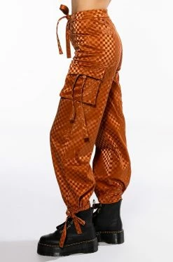 The AKIRA Label Uncovering Your Tracks Checkered PU Cargo Pants are made from a glossy vegan leather fabrication and feature checkered patterning, a high rise waist, working belt loops, patch pockets, cargo flap side pockets with faux leather straps, a relaxed fit, and cinched ankles with faux leather tie detailing. Complete with a zippered hook and bar front closure with faux leather ties.