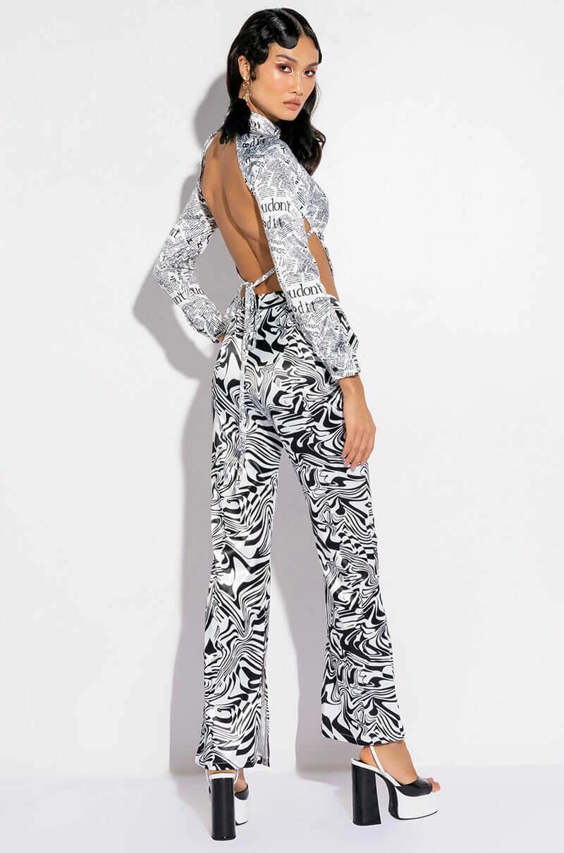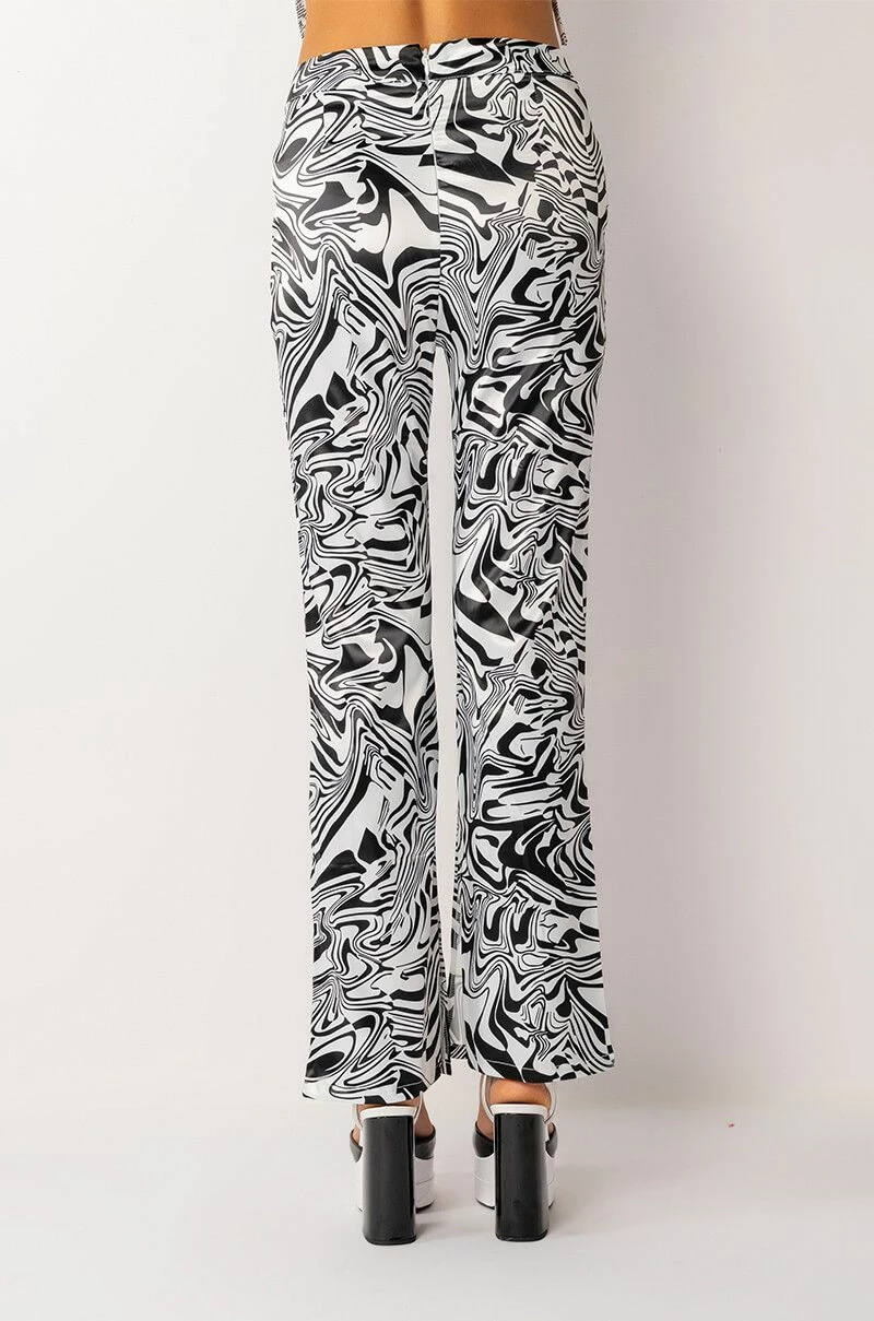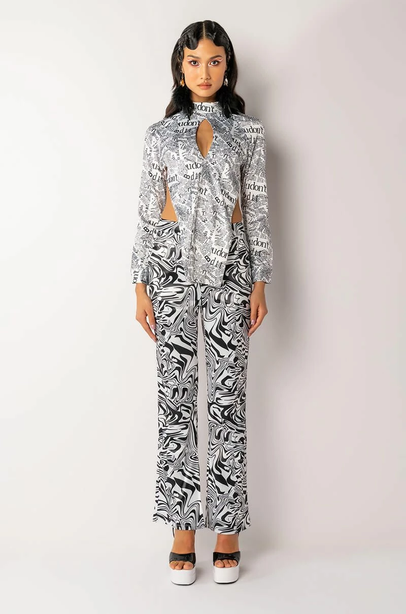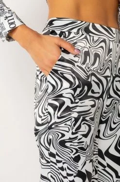 The AKIRA Label Utopia Flared Trouser is made from a lightweight satin fabrication and features a funky swirled print, a high rise waist, a thin waistband, slant side pockets, flared pant legs, and a tonal back zipper closure.