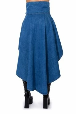 The AKIRA Label Walk On The Wild Side Denim Waist Belt is made from a cotton base denim fabrication and features a wide band base, a silver metallic buckle closure, and an attached long skirt train. Sits atop the waist for a cinched look