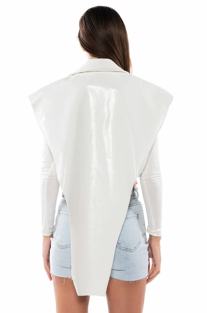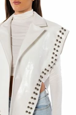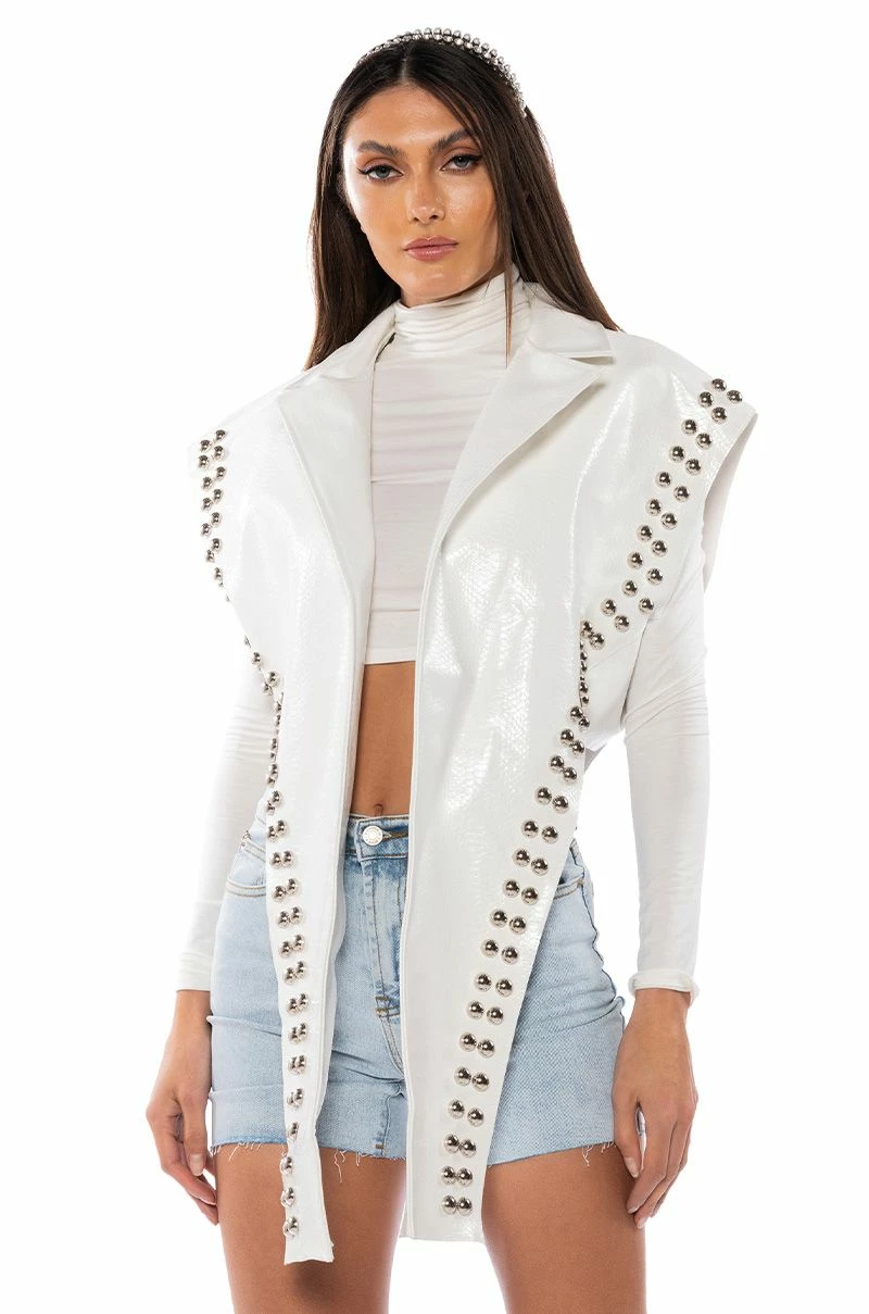 The AZALEA WANG You Already Know Moto Vest With Front Drape in White is made from a faux leather fabrication and features a notch collar, sleeveless design, rounded stud trim, an open front with drape, and a longline silhouette. Layer this piece over your fits to add some edge to your look!
