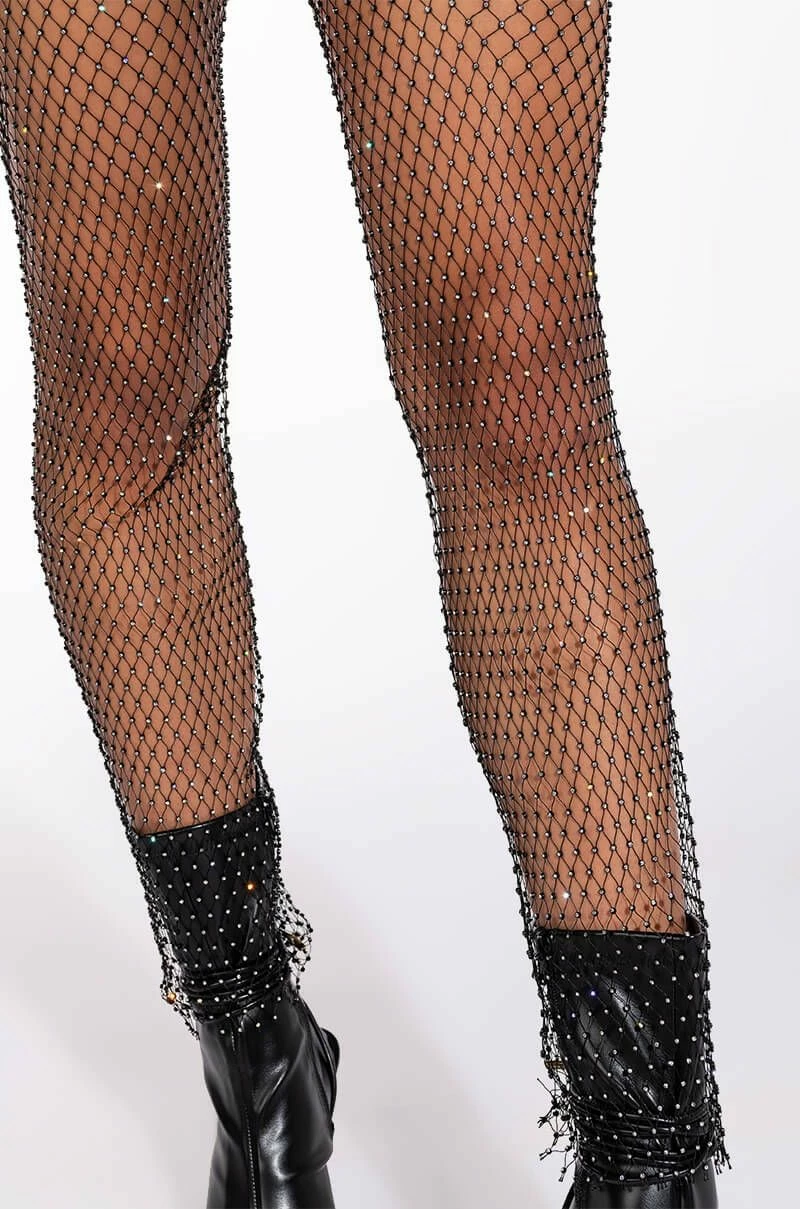 Can you keep up? The AKIRA Label You Cant Handle This Mesh Rhinestone Pant is an ultra fierce pair of high waist leggings featuring a netted mesh base, rhinestone gem embellishments, an elastic waistband, and a slim leg fit. Style over an opaque bodysuit with PVC stiletto heels to complete the look.